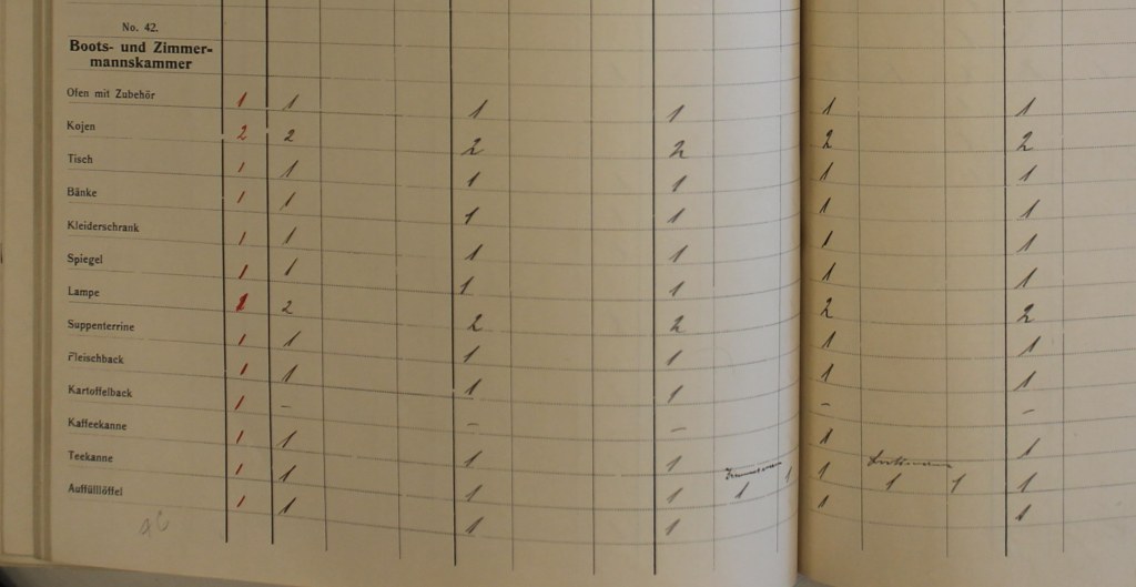 Bei den Töpfen und Pfannen waren laut Inventarliste zwei Pfannkuchen-Pfannen im Sollbestand, im Istbestand allerdings nur eine davon. Für mich ein Indiz, dass Pfannkuchen an Bord eine beliebte Speise waren. Gleiches lässt sich für Pudding sagen, denn die „Neumünster“ hatte drei Puddingformen im Istbestand (zwei im Sollbestand).