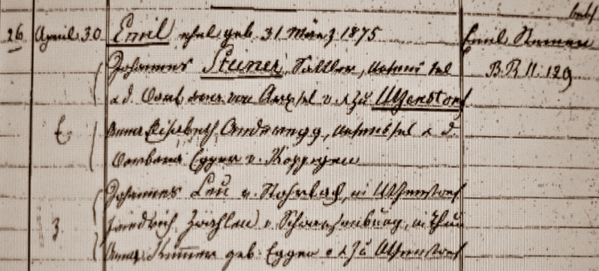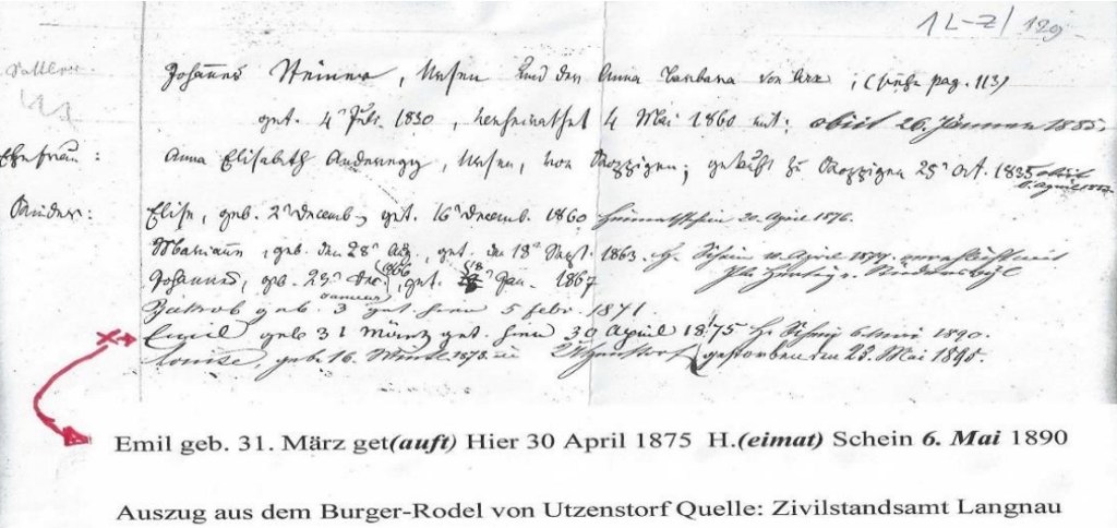 Später habe ich versucht, diesen Emil Steiner in den Kirchenbüchern von Utzenstorf ausfindig zu machen, um einen kleinen Stammbaum zu erstellen. Das war nicht einfach, denn in Utzenstorf gibt es sehr viele Familien mit dem Familiennamen Steiner und auch die Vornamen wiederholen sich laufend.