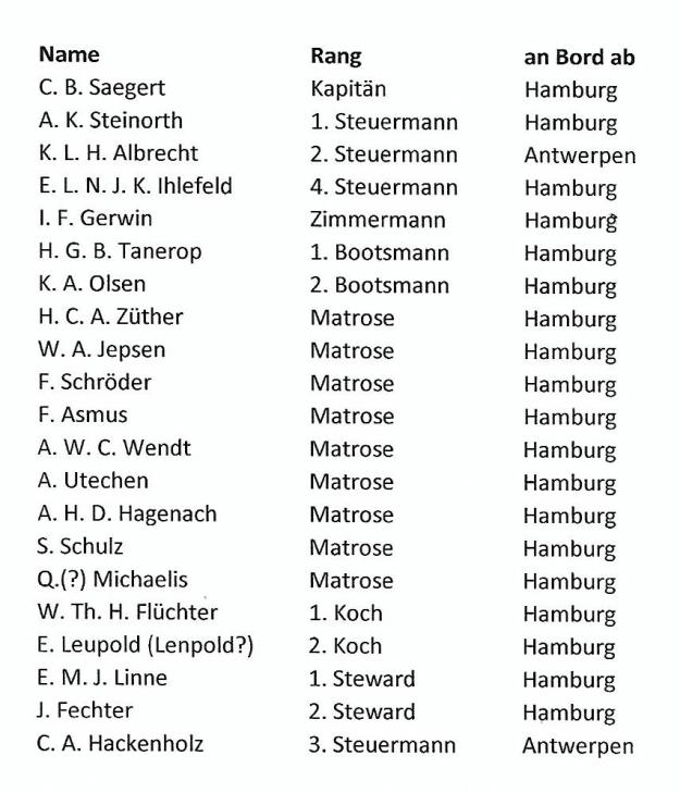 Die „Fürth“ hatte in den sieben Jahren, in denen sie in Fahrt für die Deutsch-Australische Dampfschiffs-Gesellschaft war (1907-1914), zwei Kapitäne, C. B. Saegert und W. Richter.